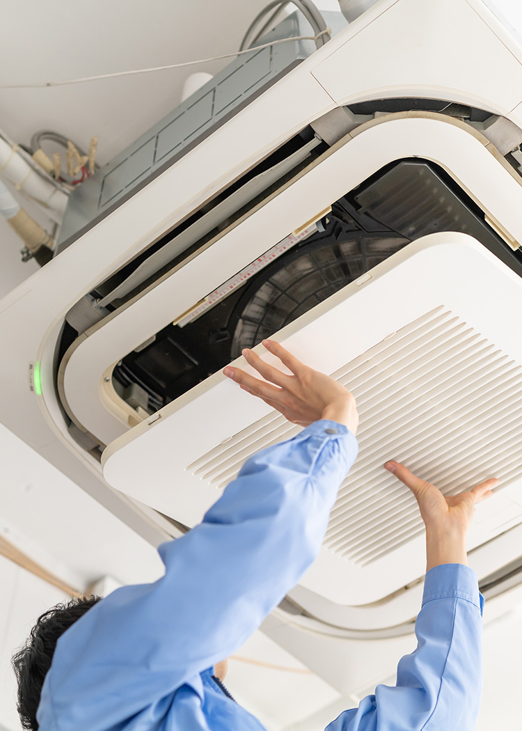 ビルや施設の建物全体に設置する業務用エアコンを抗菌コーティングする「抗ウイルス抗菌」します。接触感染から身を守る、その答えは【キノシールド】にあります。【キノシールド】は、建物全体を抗ウイルス・抗菌コーティンするから接触感染を予防することができます。
